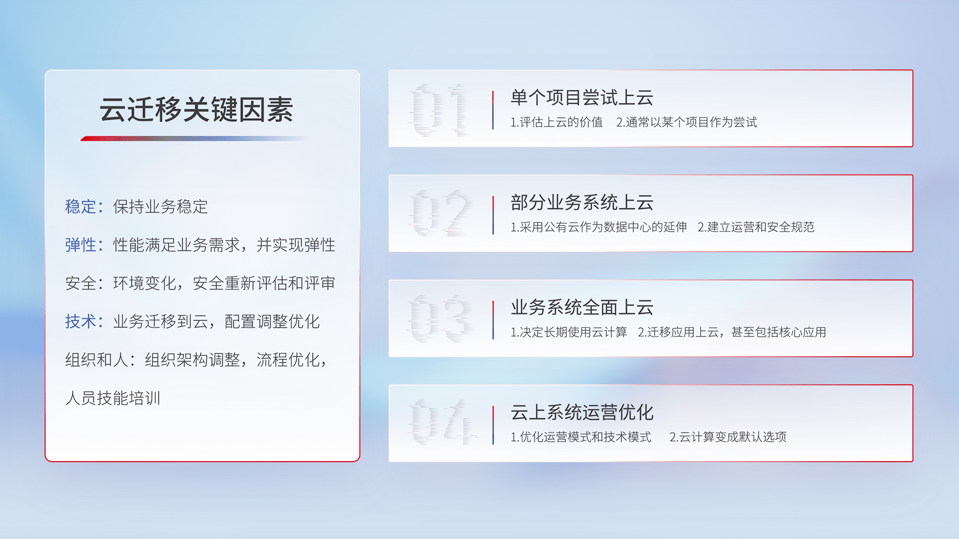 结合实际业务,,,,从规划设计、、、、云平台选型、、、云原生改造、、数据迁移、、、、集成交付,,迁移全过程为客户识别最佳上云路径,,,,做好风险识别管理,,设计网络架构、、、身份权限、、、、安全审计合规、、、、操作审计、、、、日志审计、、监控告警策略、、、、多站点容灾设计等,,,,对云上基础设施进行整体规划,,,,提升IT治理水平,,,,以满足弹性、、、、高可用、、、、高性能的需求。。。