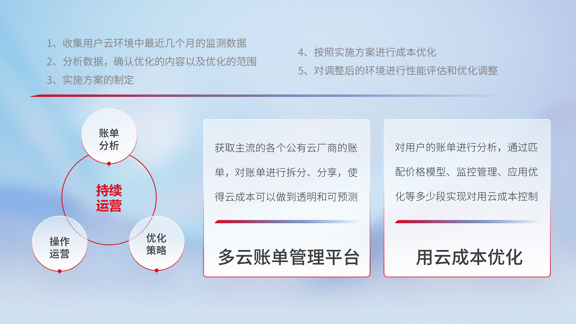 通过多云纳管,,,以统一的资源数据模型把客户的云资源进行抽象和封装,,进而实现对多云资源的统一操作,,保障云资源管理的可靠性、、、稳定性与可用性。。。。量身定制化运维内容,,,配置、、、、开发运维、、、、补丁管理、、备份、、监控、、、、认证和访问管理、、、、审计和日常巡检等,,保障在用云过程中的可靠度,,,,稳定度以及高可用率。。。。